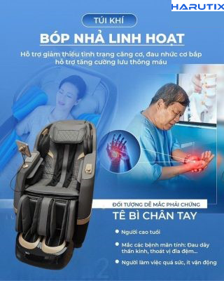 thiết kế đệm khí 5D, chip AI thông minh, 12 bài tập massage kết hợp 5 kỹ thuật massage bậc thầy, người dùng sẽ có trải nghiệm tuyệt vời khi sử dụng chiếc ghế massage này. HARUTIX FJ-2900 phát hiện vị trí điểm đau, xoa bóp uyển chuyển, nhẹ nhàng giúp cơ thể không còn mệt mỏi, giải tỏa stress.